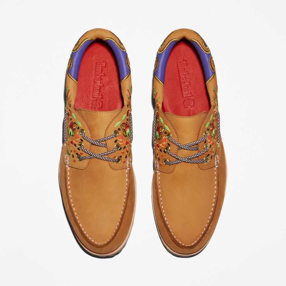 Hong Kong fashion label CLOT and Timberland have collaborated to bridge East to West.CLOT cofounder Edison Chen adds Asian-inspired designs and details to new and classic Timberland® styles,reflecting the best of both brands.Together we've reimagined our classic 3-eye boat shoe with color and Eastern-inspired silk embroidery.