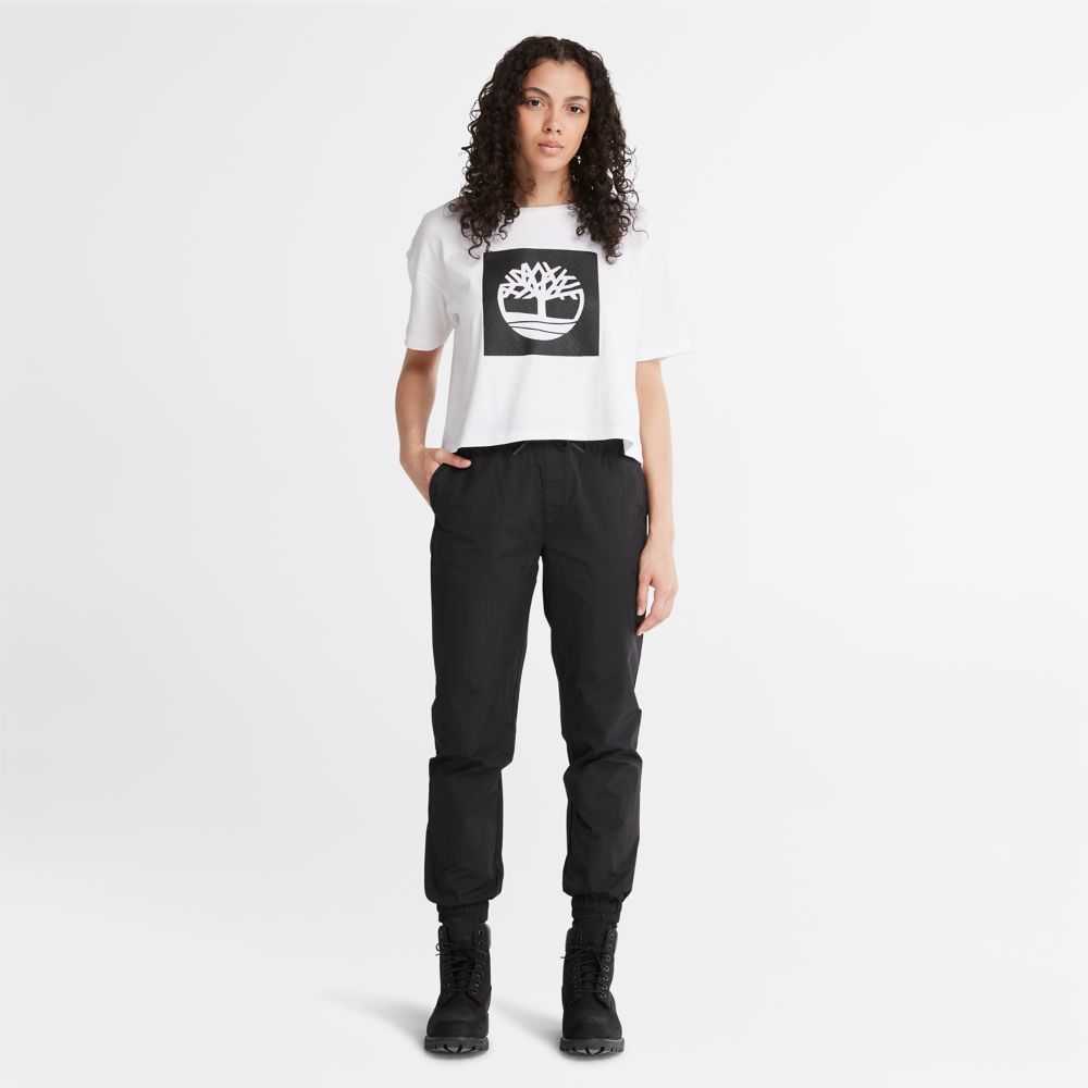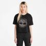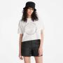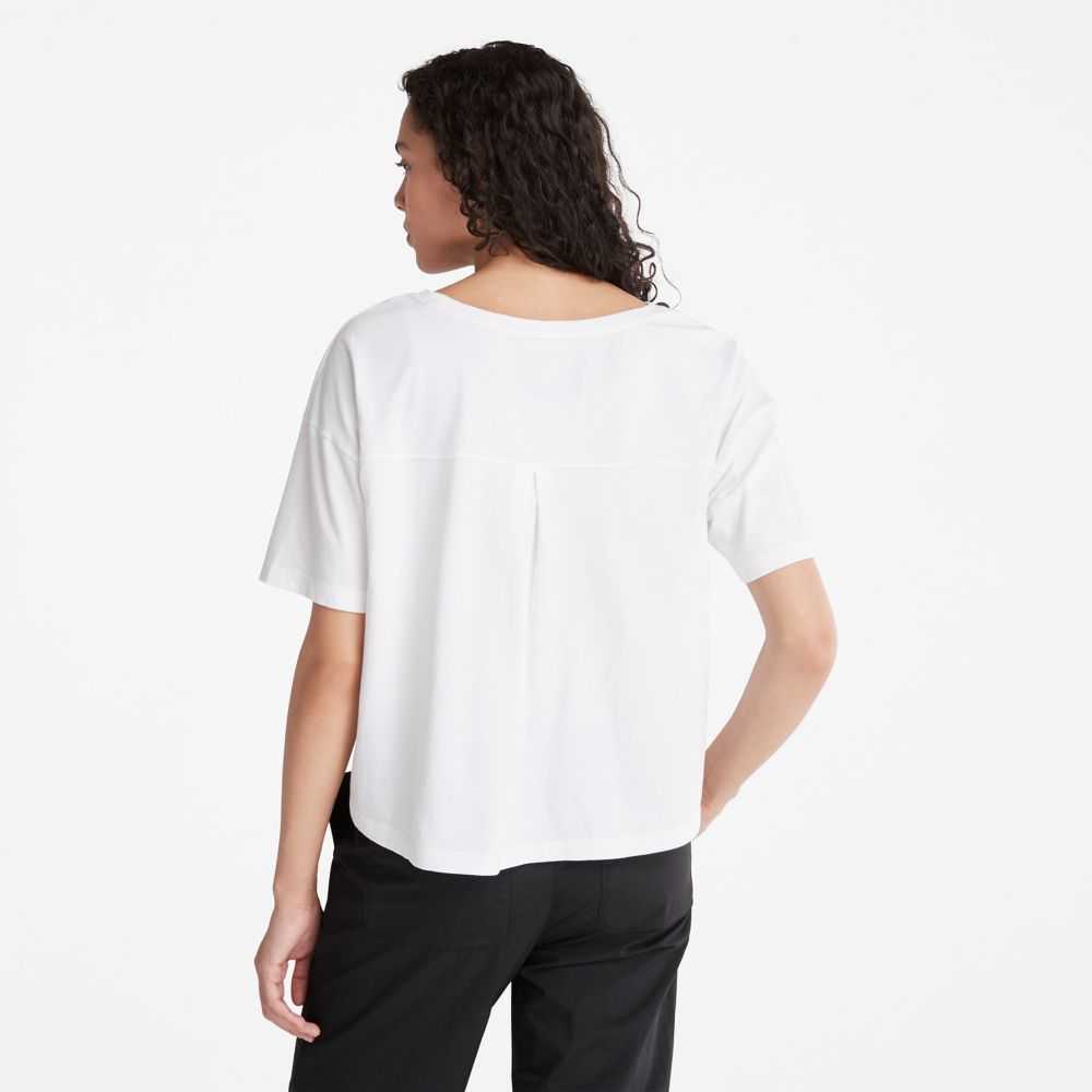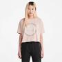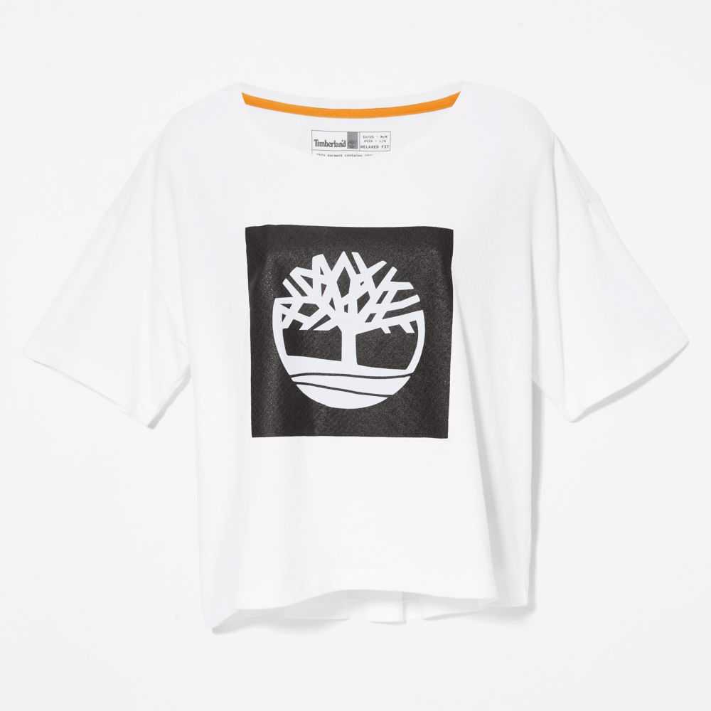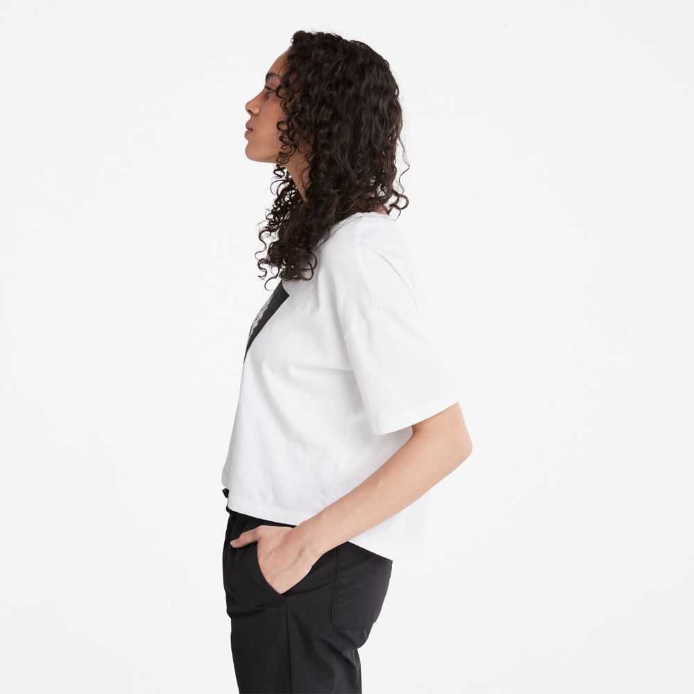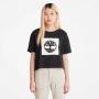 The Timberland tree logo on the chest gives a bold look to this cropped tee made entirely of cotton grown without harmful chemicals or pesticides.