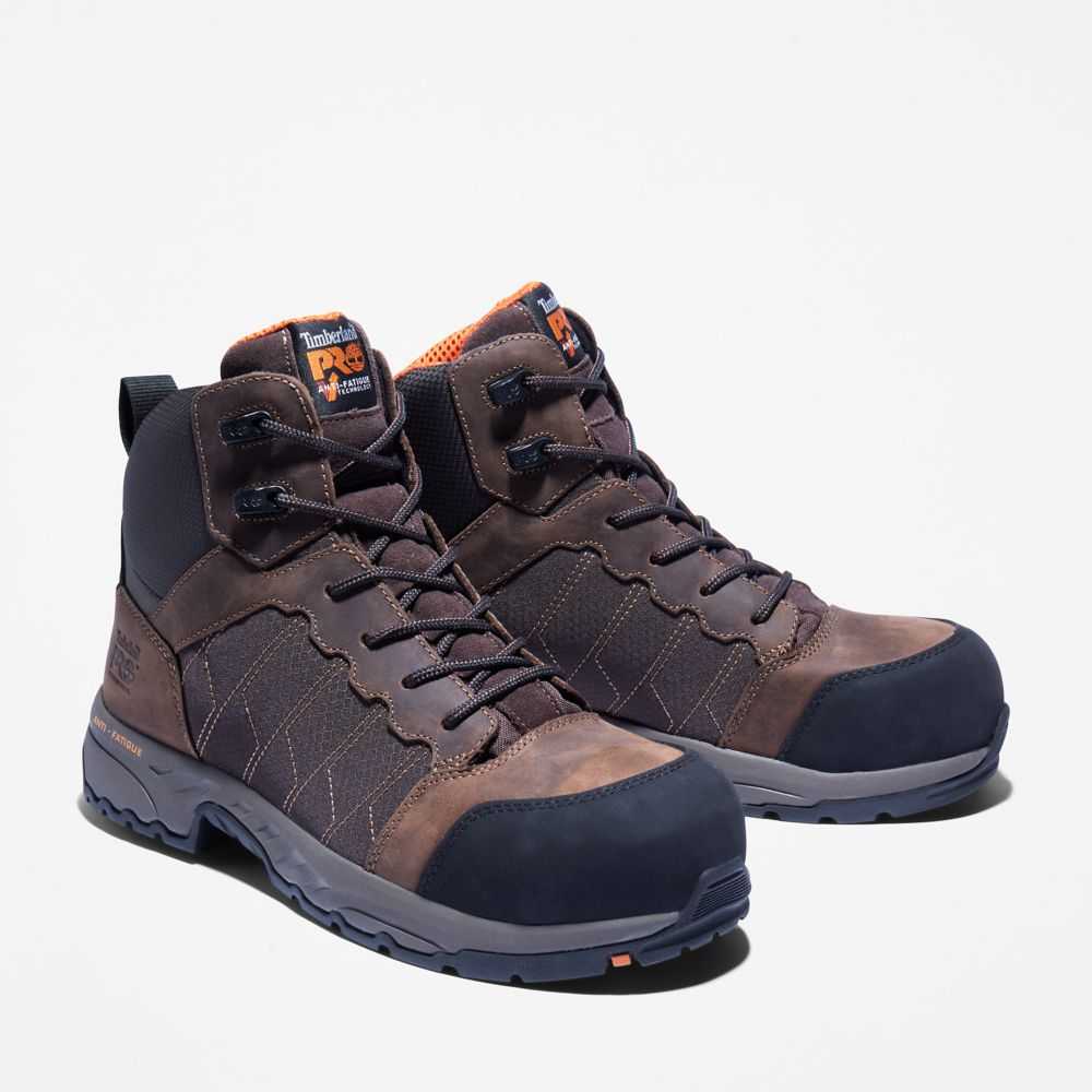 Designed for lightweight and breathable performance,these men's work boots feature an asymmetrical composite safety toe,anti-fatigue technology,a cushioning EVA midsole,and electrical hazard protection.