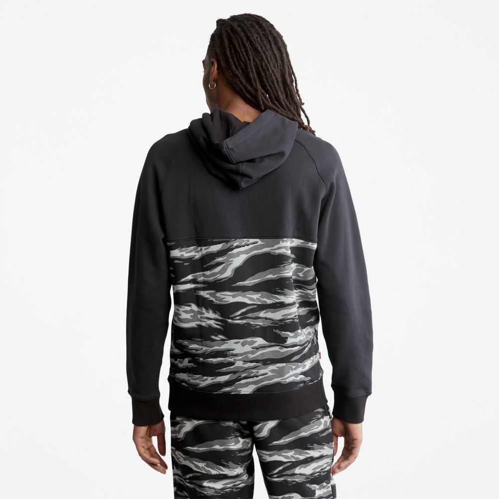 This men's hoodie features a striking allover camo tiger print - and it's made with fabric containing 80% cotton grown without harmful chemicals or pesticides.